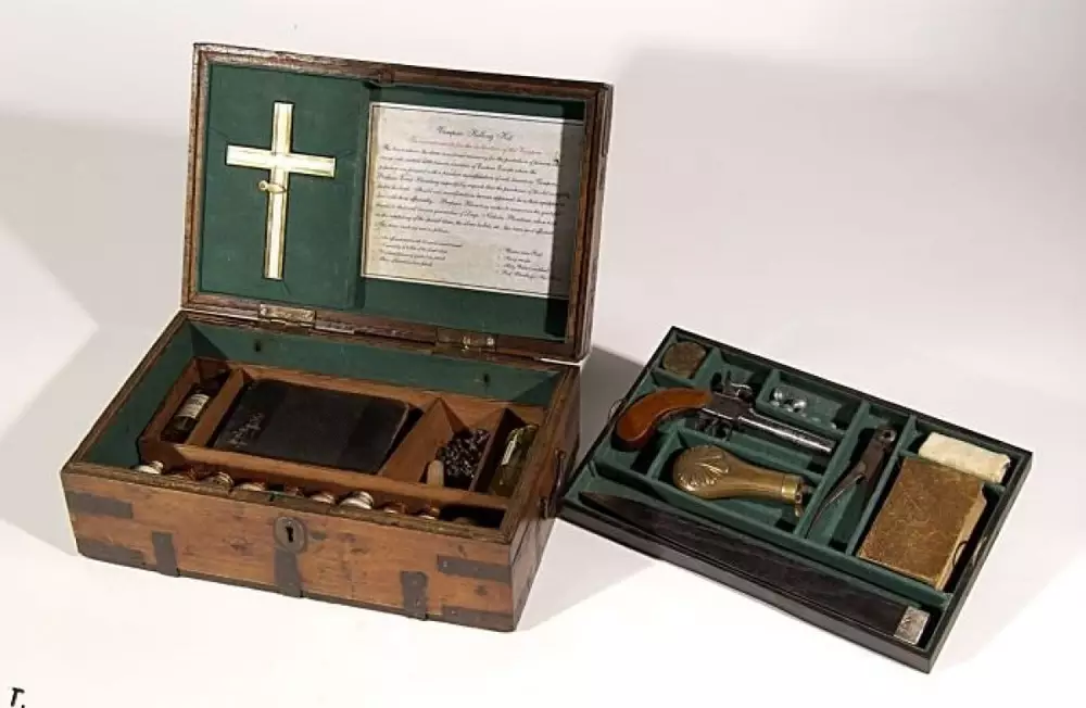 Уна Дрейдж, представитель аукционного дома "Tennants Auctioneers" в йоркширском городе Лейбурн, заявила, что никогда не видела подобную вещь. В шкатулке 19-го века аккуратно сложены распятие, пистолет, деревянные колья и молоток, а также две стеклянные бутылки со святой водой, святая земля и паста из чеснока.
