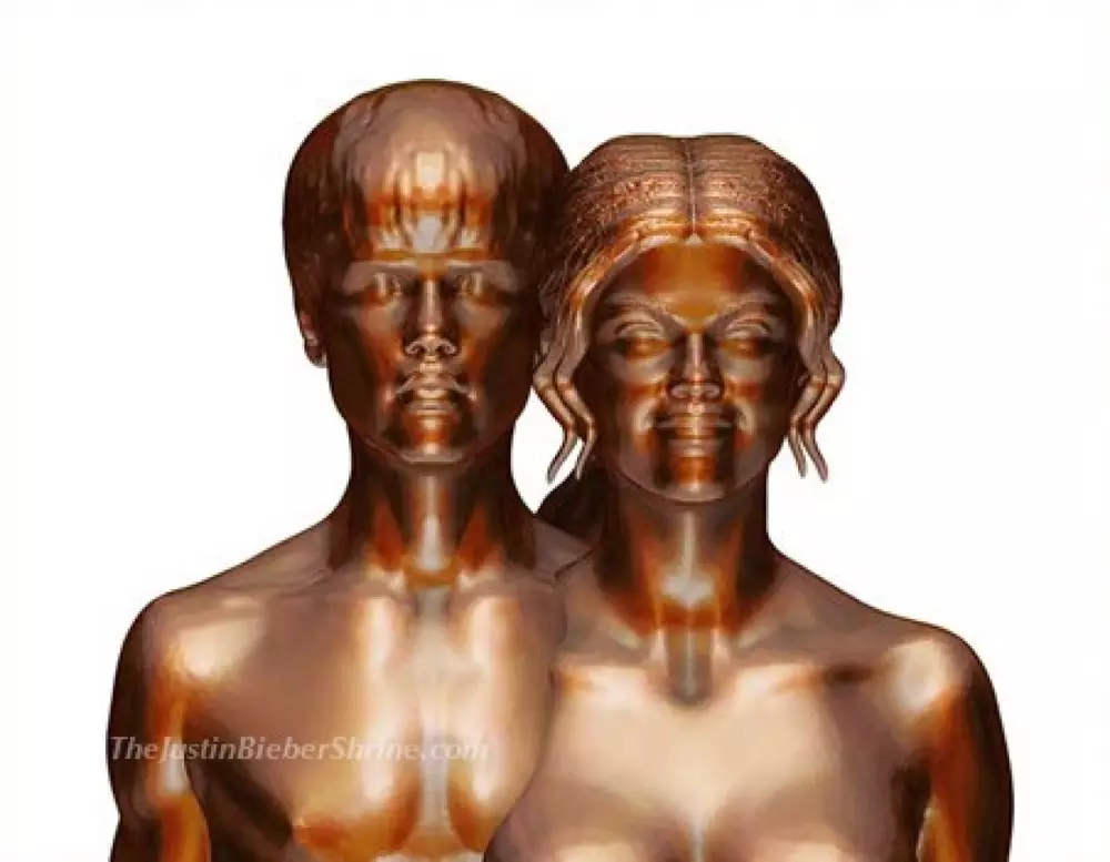 Поп-певец Джастин Бибер и его девушка Селена Гомез вдохновили скандально известного художника Дэниэла Эдвардса на создание скульптуры в образе Адама и Евы. У отлитых в бронзированном металле звезд в полный рост три ноги на двоих, что символизирует собой ""слияние пары воедино на пути в Эдем", сообщается на официальном сайте фанатов Бибера Thejustinbiebershrine.com. Интимное место любимца всех тинейджеров художник прикрыл символом Канады, а уроженки штата Техас Селены Гомез - техасской звездой. Перед фигурами пары стоят символизирующий Канаду гусь и символ Техаса - броненосец. По мнению Эдвардса, объединение обнаженных Джастина и Селены олицетворяет собой вечную дружбу, родство и "великую гармонию" их родных стран - Канады и США. Такие скульптуры необходимо установить в каждом посольстве Канады по всему миру как "знак доблести и успехов страны в области искусства и бизнеса", считает безумный художник, известный своими скульптурами Бритни Спирс во время родов, Анджелины Джоли и Брэда Пита, и супруги президента США Мишель Обамы.