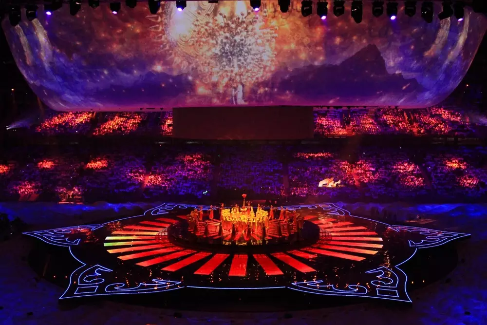 Праздничная программа проходит с использованием 3D-технологий. На стадионе установлены 40 телекамер, которые снимают все происходящее на "Астана-Арене". Каждому приглашенному на шоу гостю раздали рюкзаки, в которых различные предметы реквизита. С их помощью зрители создадут огромное полотно - флага Казахстан, затем сделают бумажных голубей и выпустят их на сцену.