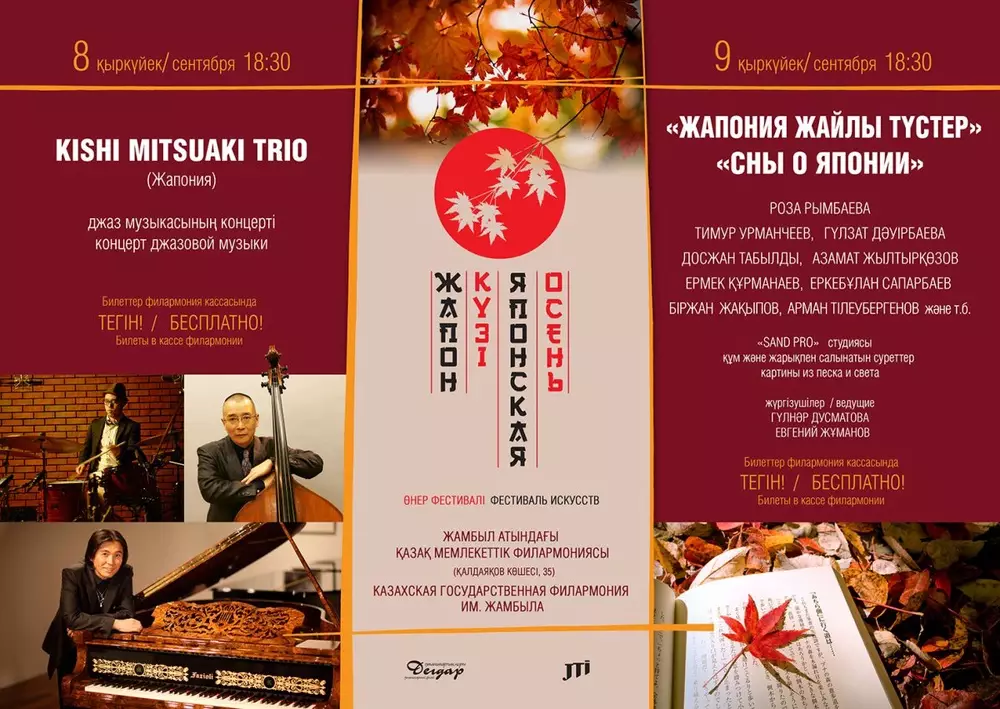 В этом году в рамках фестиваля "Японская осень" в Государственной филармонии имени Жамбыла пройдут два концерта. 8 сентября выступят мастера джаза из Японии - трио Киши Мицуаки. Лидер группы Мицуаки широко известен в мире джаза, он является обладателем премии Selective Gold Disc журнала Swing. Для казахстанского зрителя команда готовит музыкальный сюрприз. Музыканты исполнят казахскую народную мелодию в джазовой интерпретации.