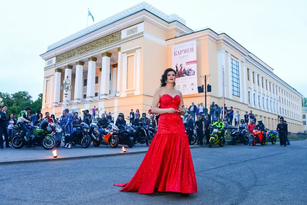 Артисты и музыканты Казахского государственного академического театра оперы и балета имени Абая в преддверии премьеры обновленной постановки оперы "Кармен" выступили перед зданием театра вместе с алматинскими байкерами, сообщает корреспондент Tengrinews.kz.