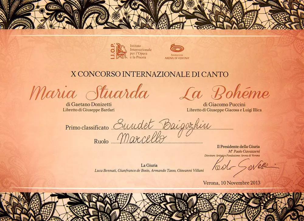 Победителями конкурса стали Сундет Байгожин, Медет Чотабаев и Альфия Каримова. Призом для лауреатов данного конкурса - Байгожина и Чотабаева - станет исполнение заглавных партий в опере "Богема" в апреле 19 марта 2014 года в зимнем зале Arena di Verona, для Альфии Каримовой - участие в опере "Мария Стюарт".