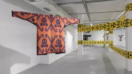 На выставке также можно будет увидеть новую site-specific-инсталляцию Диляры Каиповой, которая переосмысливает пространство галереи с помощью ткани и вовлекает самого зрителя в работу. Сама абровая ткань, созданная сплетением волокон, также является миниатюрной пространственной структурой. Художница акцентирует внимание на том, что предметом ее творчества являются не халаты, а ткань. И прежде она не ограничивалась созданием халатов, часто ее ткани принимали и другие формы, но автор впервые создала инсталляцию монументального масштаба для выставки в Алматы, порождая новые пространственные отношения между зрителем и тканью.