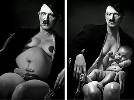 В Индонезии художник Рональд Маннулланг (Ronald Manullang) нарисовал Адольфа Гитлера в виде полуобнаженной беременной Девы Марии, сообщает Orange News. Из-под кисти художника вышла целая картин под названием "Суд Божий". По словам автора, своими работами он хотел наказать фюрера за совершенные грехи. На одной из картин ангел объявляет Гитлеру о рождении ребенка. На другом полотне фюрер изображен с младенцем Иисусом на коленях. На третьей картине на плечо Гитлера нанесен татуированный лагерный номер, он демонстрирует обнаженную женскую грудь. "Этот ужасный, могущественный человек вынужден кормить грудью, петь колыбельные и ласкать ребенка, которого он глубоко ненавидит. Это подходящее наказание за его прошлые грехи", - считает художник. По его мнению, Суд Божий на Гитлером должен выглядеть именно таким образом.