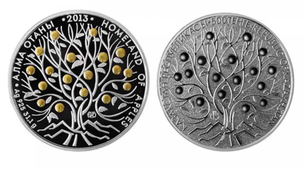 Монета изготовлена из серебра 925 пробы, ее масса составляет 31,1 грамма, диаметр - 38,61 миллиметра, тираж - семь тысяч штук. На лицевой стороне (аверсе) памятной монеты, выпущенной Нацбанком, в центральной части, на матированной поверхности, расположено стилизованное изображение плодоносящей яблони, корнями уходящей в гористую местность. Это символизирует ареал благоприятного произрастания яблок. Также на лицевой стороне изображен логотип Нацбанка. По окружности надпись "ҚАЗАҚСТАН РЕСПУБЛИКАСЫ" на государственном языке, "500 ТЕҢГЕ" обозначающая номинал монеты, и "REPUBLIC OF KAZAKHSTAN" на английском языке.