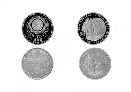 В нижней части памятные монеты из нейзильбера имеют надпись "50 ТЕҢГЕ". Слева и справа от номинала изображен элемент национального орнамента, а по окружности - надпись "ҚАЗАҚСТАН ҰЛТТЫҚ БАНКІ" и выступающий кант. "На оборотной стороне обеих памятных монет расположены изображение фрагмента мемориала Славы в парке имени 28 гвардейцев-панфиловцев в Алматы, дата "1945", обозначающая год Победы в Великой Отечественной войне, и дата "2015", обозначающая год чеканки монеты. По окружности - надписи "ҰЛЫ ЖЕҢІСКЕ 70 ЖЫЛ", "70 ЛЕТ ВЕЛИКОЙ ПОБЕДЕ" и выступающий кант", - прокомментировали в Нацбанке.