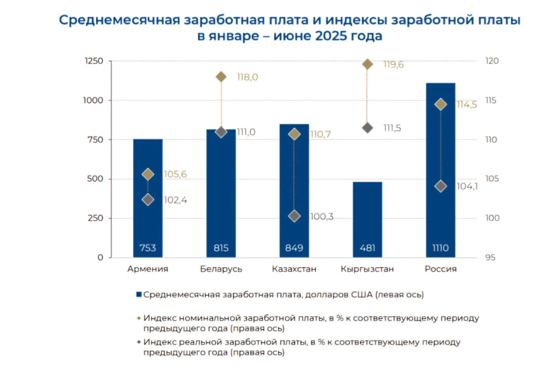 В странах ЕАЭС наблюдается тенденция к росту зарплат, но процентное увеличение больше в странах с более низким уровнем дохода.