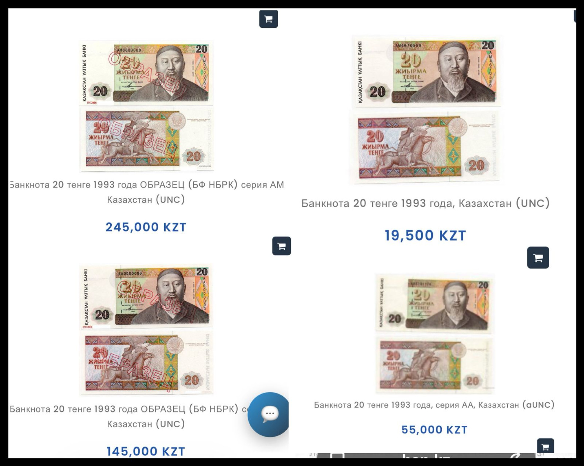 Мы проверили актуальные предложения на сайте по продаже коллекционных монет и банкнот. Цены на 20-тенговую купюру сильно различаются: от 19 500 тенге до 246 000 тенге.