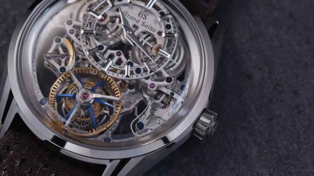 Речь идет о модели Grand Seiko Kodo Constant-Force Tourbillon, отличающейся своим уникальным механизмом. Это первые в истории часы, где турбийон был объединен с механизмом постоянной силы на одной оси. Сам аксессуар заключен в титановый корпус, а задняя крышка выполнена из сапфирового стекла, благодаря чему можно увидеть сложную конструкцию часов. На создание изделия у мастеров ушло более десяти лет работы.