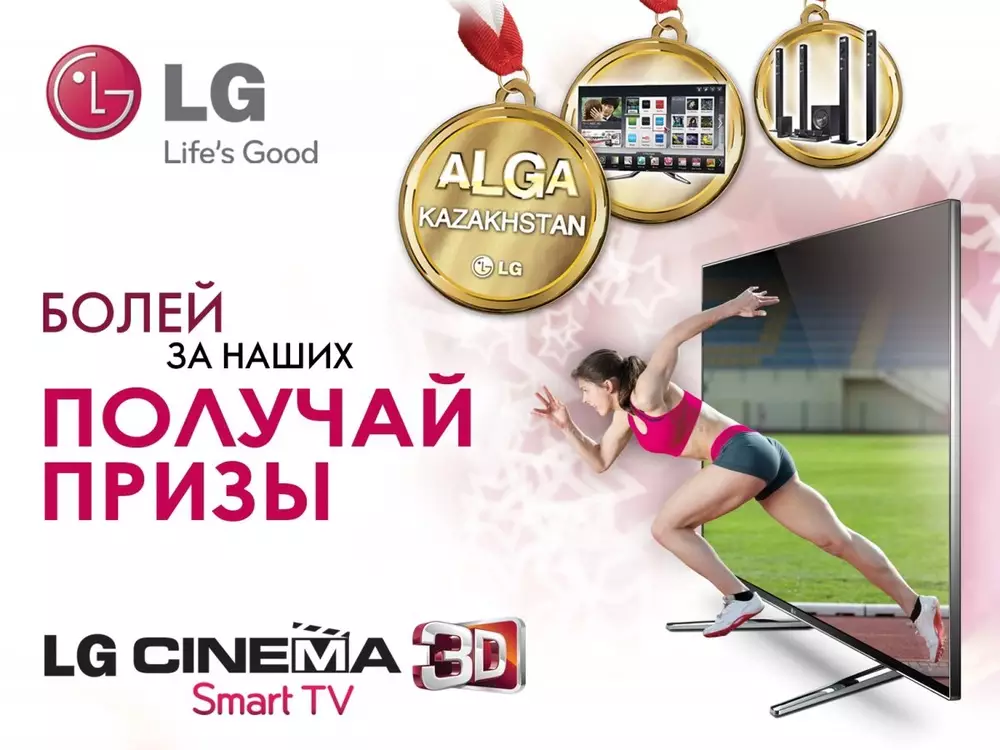 Компания LG Electronics проводит промоакцию: при покупке телевизора LG Cinema 3D SMART TV у каждого покупателя появляется возможность получить невероятное количество подарков от LG. Основные условия и правила проведения акции "aLGa Казахстан! Болей за наших и получай призы!" 1. Территория проведения акции - Республика Казахстан. 2. Партнеры проведения акции - сети магазинов, действующих под товарными знаками Fora, Sulpak, "Квант", "Мечта", "Планета Электроники", "Технодом", "Эврика" и "Фирменный магазин LG" (в Алматы). 3. Период проведения акции - с 26 июля 2012 года по 31 августа 2012 года. 4. В акции могут принимать участие граждане Республики Казахстан, достигшие 18 лет, которые в период с 26 июля 2012 года по 12 августа 2012 года приобрели телевизор Cinema 3D Smart TV торговой марки LG моделей 42LM620T; 42LM660T; 42LM670T; 42LM761T; 47LM620T; 47LM660T; 47LM761T; 55LM620T; 55LM660T; 55LM960V. 5. Акция состоит из двух этапов. На первом этапе каждый покупатель - участник акции - при покупке телевизора Cinema 3D Smart TV торговой марки LG в магазине Партнера проведения акции в период с 26 июля 2012 года по 12 августа 2012 года получает гарантированный подарок - технику торговой марки LG на выбор в зависимости от модели купленного телевизора. Также покупателю - участнику акции - при покупке телевизора предоставляется купон участника акции для участия на втором этапе. 6. Для участия на втором этапе покупателю необходимо: заполнить все поля купона: название магазина, где произведена покупка, модель и серийный номер купленного телевизора, дата покупки и сохранить купон, а также чек покупки до завершения второго этапа. Купон остается у участника. 7. К участию на втором этапе допускаются купоны, полученные участниками в срок до 12 августа 2012 года включительно. 8. На втором этапе каждый покупатель - обладатель купона - в период с 14 августа 2012 года по 31 августа 2012 года получает право на скидку при покупке любой модели телевизора торговой марки LG. Размер получаемой скидки для всех участников рассчитывается как сумма произведений количества каждого вида медалей, завоеванных казахстанской сборной в Лондоне в период с 27 июля 2012 года по 12 августа 2012 года, на коэффициент скидки: золотая медаль - коэффициент скидки 5000 тенге, серебряная медаль - коэффициент скидки 3000 тенге, бронзовая медаль - коэффициент скидки 1000 тенге. Пример: если сборная Казахстана завоюет 3 золотые, 7 серебряных и 4 бронзовые медали, соответственно, сумма скидки составит 40 000 тенге исходя из расчета: 3 золотых * 5000 тенге + 7 серебряных * 3000 тенге + 4 бронзовые * 1000 тенге = 40 000 тенге единовременной скидки. 9. Расчет суммы скидки будет произведен на основании данных о количестве завоеванных медалей, опубликованных новостным порталом Nur.kz от 14 августа 2012 года. 10. Итоговая сумма скидки будет опубликована на сайте www.lg.kz. Скидки по купонам не суммируются. 11. Для получения скидки покупателю необходимо будет прийти за покупкой любой модели телевизора торговой марки LG в сеть магазинов - партнера проведения акции, где был получен купон участника, и предъявить чек покупки, копию удостоверения личности, копию РНН и купон акции (в виде медали). Для получения скидки допускаются купоны без повреждений, содержащие всю запрашиваемую информацию. 12. Замена подарков и полученных скидок на денежный эквивалент либо на другие товары не допускается. 13. Подарки могут отличаться от заявленных в рекламных материалах акции и заменены н