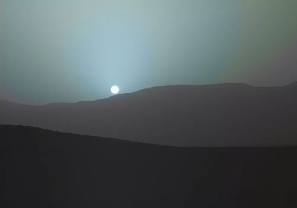 Как видно на снимках, на Марсе, когда светило уходит за горизонт или восходит, в небе появляются оттенки голубого и синего цветов, в отличие от нашей планеты, где небо окрашивается в оранжевый или красный цвета. Это связано с тем, что в атмосфере Марса в большом количестве присутствует пыль, которая лучше рассеивает именно синий спектр солнечного цвета.