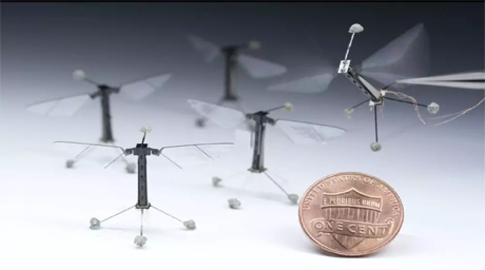"Робомуха" (robo-fly) стал самым маленьким летающим роботом в мире. Робот изготовлен из углеродного волокна, весит доли грамма и имеет сверхбыстрые электронные "мышцы" для работы крыльев. Их движение обеспечивают сокращения пьезоэлектрического материала при разрядах тока. Частота взмахов крыльев робота - 120 в секунду, что позволяет ему порхать в воздухе.