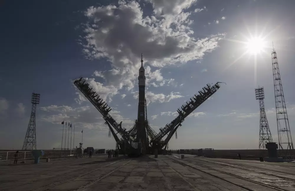 На "Байконуре" установили ракету "Союз" Ракета-носитель "Союз" на стартовой площадке космодрома "Байконур". ©REUTERS