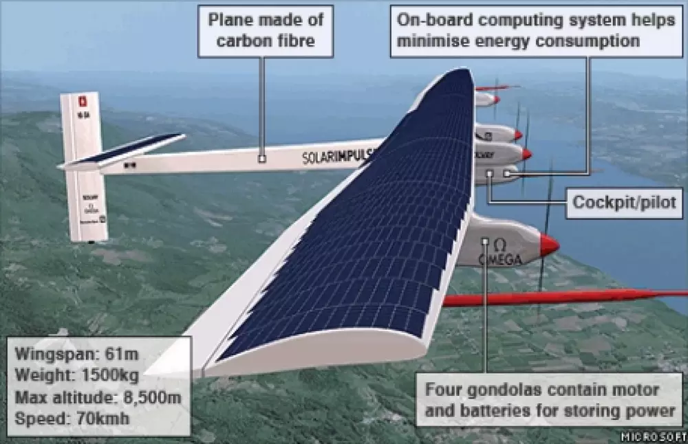 Летательный аппарат является первым пилотируемым самолетом, использующем энергию солнца. Он был построен швейцарским аэронавтом Бертраном Пикардом. Solar Impulse запасает энергию в дневное время, его крейсерская скорость - 70 километров в час. Он имеет размах крыльев, сравнимый с Airbus A340 - 63 метра. Масса аппарата -1600 килограммов.