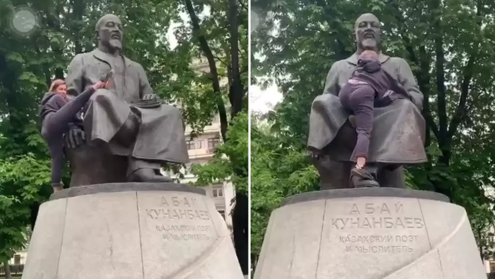 Блогер из Москвы по имени Илона залезла на памятник, посвященный казахскому поэту Абаю Кунанбаеву. Видео прислал на редакционный WhatsApp-номер читатель Tengrinews.kz.