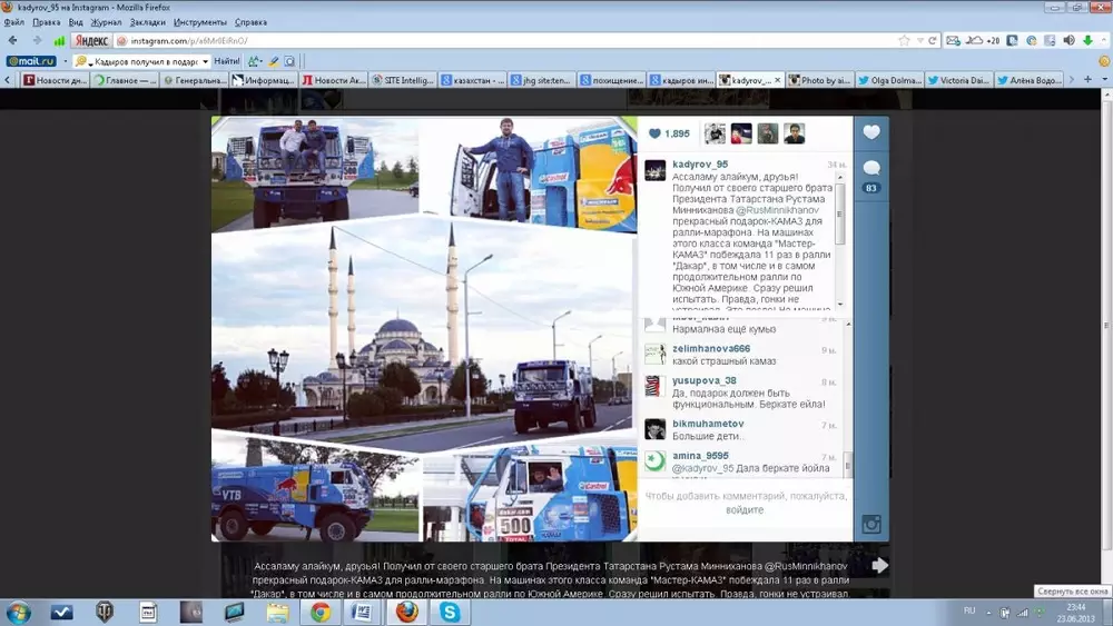 "Получил от своего старшего брата президента Татарстана Рустама Минниханова прекрасный подарок - КамАЗ для ралли-марафона. На машинах этого класса команда "Мастер-КамАЗ" побеждала 11 раз в ралли "Дакар", в том числе и в самом продолжительном ралли по Южной Америке. Сразу решил испытать. Правда, гонки не устраивал. Это после! Но машина мне очень понравилась", - прокомментировал Кадыров свою фотографию с машиной.
