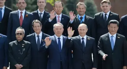 Нурсултан Назарбаев встретился с Пан Ги Муном и лидерами 7 государств в Москве Совместное фотографирование глав делегаций в Александровском саду после военного парада в ознаменование 70-летия Победы в Великой Отечественной войне 1941-1945 годов. Фото с сайта www.may9.ru