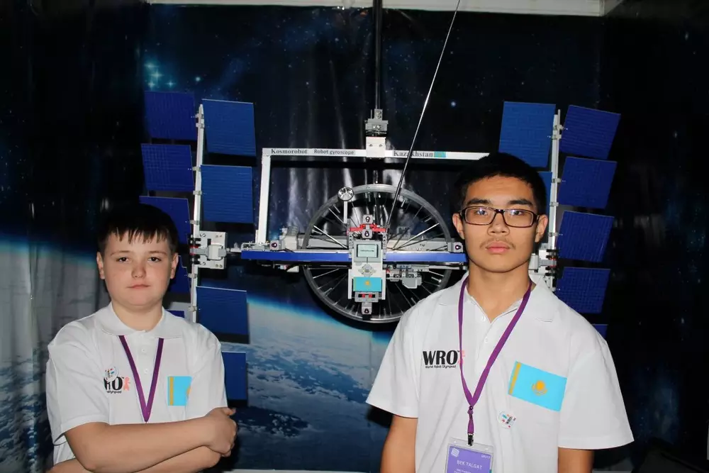 Из Казахстана на конкурс отправились 27 детей, победителей республиканской олимпиады по робототехнике. Их поездку организовало АОО "Назарбаев Интеллектуальные школы". Приз за третье место в открытой категории на олимпиаде по робототехнике получила команда из Талдыкоргана. Как пояснил преподаватель робототехники Николай Авдюнин его подопечные - учащийся восьмого класса, 14-летний Ратмир Сартбаев и ученик девятого класса, 15-летний Бек Талгатт - создали прототип робота, которого можно использовать для разворота космических станций в пространстве. Разворот необходим для того, чтобы направить фотоэлементы в нужном направлении для получения энергии Солнца.