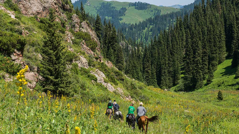 Рельеф Заилийского Алатау в основном горный, но по местным лесам, плато, высокогорным лугам очень удобно ездить на лошадях, поскольку некоторые маршруты труднопроходимы или слишком длинны для пеших прогулок. Конными тропами здесь любят ездить как местные жители, так и туристы - и здесь действительно есть, из чего выбрать: