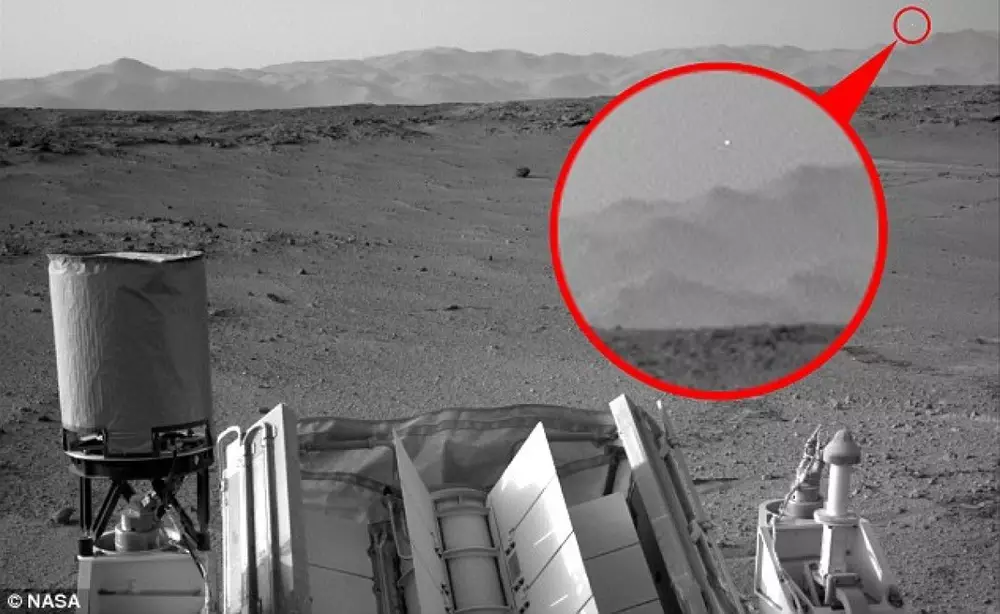 НЛО был захвачен сначала правой камерой марсохода, а затем левой. На обоих снимках отчетливо видна яркая белая точка, расположенная выше горизонта.