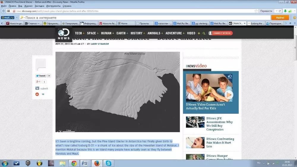 От Антарктиды откололся гигантский айсберг, сообщает ZME Science. Айсберг, получивший название B-31, отделился от ледника "Сосновый остров" (Pine Island Glacier). Его длина составляет 35 километров, а ширина - 20 километров. По размерам айсберг сравним с Сингапуром или штатом Дубаи. Ученые обнаружили формирующийся раскол в 2011 году. Позже инфракрасные и радиолокационные исследования показали, что трещина растет примерно на четыре километра в год, и отделение айсберга неизбежно. Главной причиной разрушения ледника ученые считают потепление воды. Предсказать, куда будет двигаться B-31, невозможно, это зависит от его высоты. "Если бросить палку в горную речку, она будет вращаться, плыть то быстро, то медленно. Я считаю, что движение айсберга будет схожим. Представьте, что это очень большая палка", - заявил ученый НАСА Роберт Биндшадлер (Robert Bindschadler).