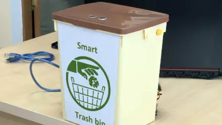 За основу автоматизированного мусорного ведра Арман Нурышев взял контейнер для порошка. Емкость оснащена ультразвуковыми датчиками движения, которые срабатывают при приближении к урне.