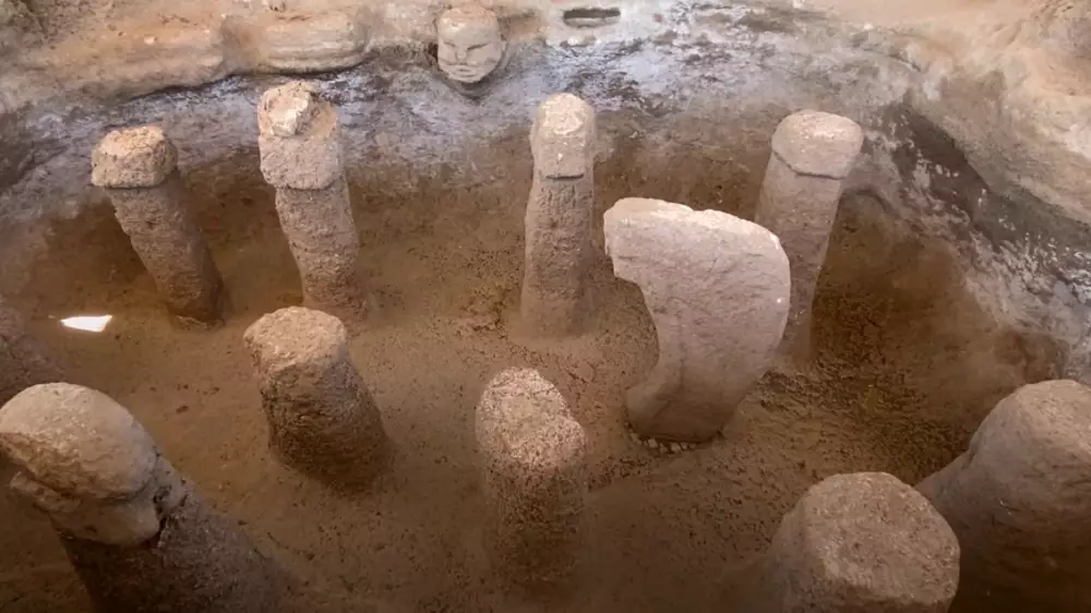 Еще одной важной и интригующей находкой в Карахантепе стало здание округлой формы диаметром 23 метра. Руководитель раскопок отмечает, что его большая часть была высечена в скале и уходила на глубину 5,5 метра от поверхности. Это означает, что данное сооружение было возведено усилиями многих доисторических "инженеров".