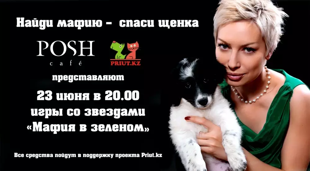 Девиз мероприятия: "Найди мафию - спаси щенка!". Такая акция проводится с целью поддержки бездомных животных и популяризации дворняжек у казахстанцев. Свое согласие на участие уже дали резиденты проекта "Наша КZаша", актриса Диляра Байжанбаева, шоумен Роман Миронов.