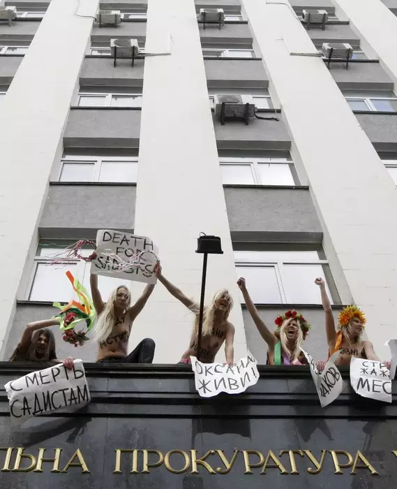 Девушки потребовали жестоко наказать садистов из Николаевской области, которые 9 марта изнасиловали и попытались сжечь 18-летнюю Оксану Макар. Несколько обнаженных по пояс феминисток оккупировали вход в здание генпрокуратуры и начали скандировать: "Оксана, живи!", "Смерть садистам!" и "Казнить ублюдков!".