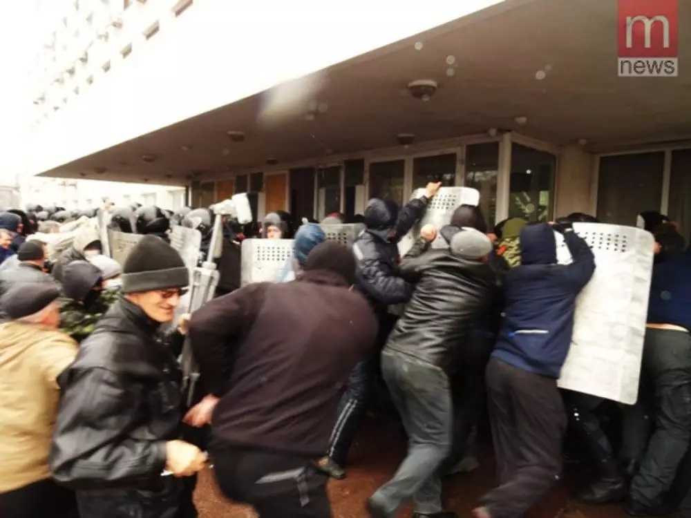Люди кричат "Таруту - вон!", "Милиция с народом!","Губареву - свободу!". Сняты украинские флаги, как со здания госовета, так и с Гипромеза. Вместо них водружены красные флаги и так называемый, флаг ДНР.