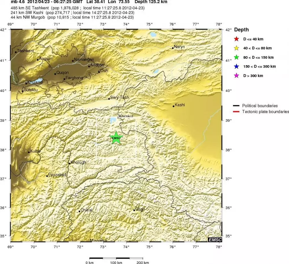 Подземные толчки, энергетический класс которых составил 11, были зафиксированы 23 апреля в 12.27 по времени Астаны. Как сообщает Европейско-Средиземноморский сейсмологический центр, эпицентр землетрясения находился в 485 километрах юго-восточнее Ташкента (Узбекистан) и в 44 километрах северо-западнее города Мургаб (Таджикистан).