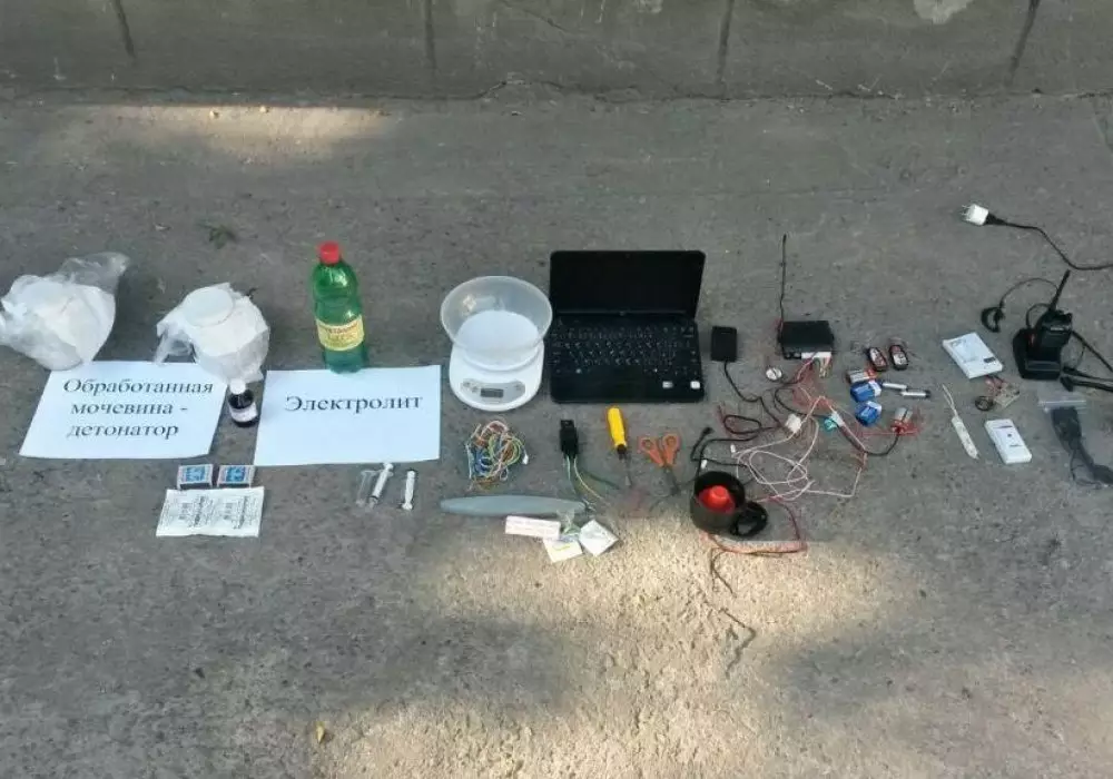 В ходе проведенного обыска у задержанного были обнаружены и изъяты компоненты самодельного взрывного устройства (аммиачная селитра, перекись водорода, поражающие элементы в виде шурупов и гвоздей), измельченный серный порошок, детонирующий шнур, бутылки с кислотой, мобильные телефоны, приспособленные в качестве пускового механизма, замыкатели электрической сети СВУ.