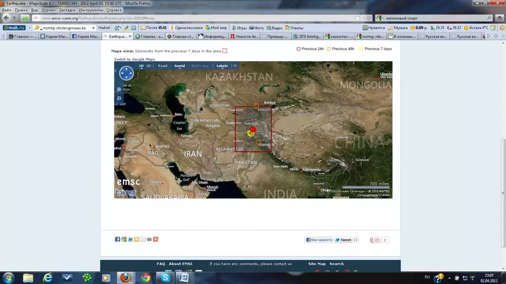Землетрясение магнитудой 4,7 произошло в Таджикистане Карта с указанием эпицентра землетрясения с сайта emsc-csem.org