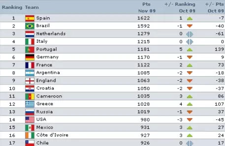 Между тем, среди лидеров рейтинга произошли изменения. Сборная Испании потеснила с первого места бразильцев. Чемпионы Европы 2008 года опережают пентакампеонов на 30 очков.