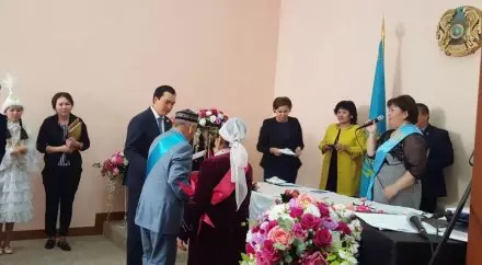 Местный акимат в рамках акции "Я благодарен судьбе" решил поздравить почетные пары района, отправив их в РАГС на празднично украшенных лимузинах. Юбиляры расписались в книге записи актов гражданского состояния, а затем обменялись кольцами. В честь праздничного события аким района лично вручил пожилым парам памятные подарки и фотоальбомы.