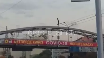 Жителей Алматы напугал экстремал, передвигавшийся по арке пешеходного моста на руках, передает корреспондент Tengrinews.kz.