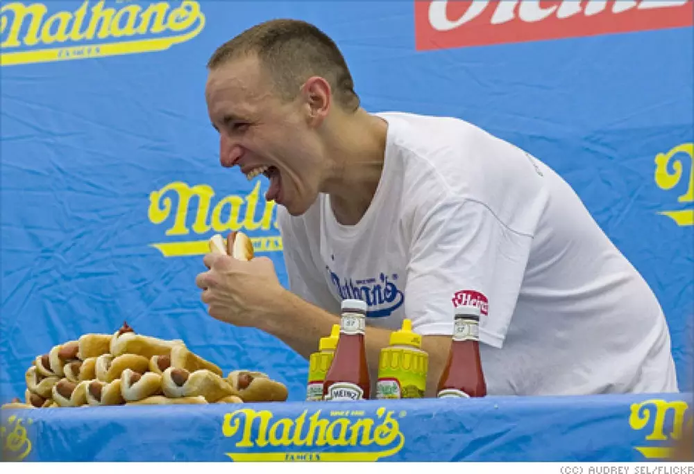 На чемпионате мира по скоростному поеданию хот-догов, приуроченном к празднованию Дня независимости США, победил житель Калифорнии Джой Честнат по прозвищу Челюсти, сообщает телеканал ABC News. За десять минут 26-летний Честнат съел 62 булочки с сосиской. Его ближайший соперник Патрик Бертолетти по прозвищу Глубокая миска (Deep Dish) отстал на девять хот-догов. Честнат выигрывает это соревнование пятый раз подряд. Его рекорд - 68 хот-догов за десять минут. Победительницей чемпионата среди женщин стала 42-летняя Соня Томас по прозвищу Черная вдова. Она съела 40 хот-догов. Свое прозвище Томас получила после того, как несколько раз выигрывала у мужчин конкурсы по скоростному поеданию различных продуктов. По данным РИА Новости, в 2010 году Томас победила даже Честната. На фестивале куриных крылышек в Буффало она съела 2,2 килограмма крылышек за 12 минут, тогда как Челюсти расправился только с 2,06 килограмма.
