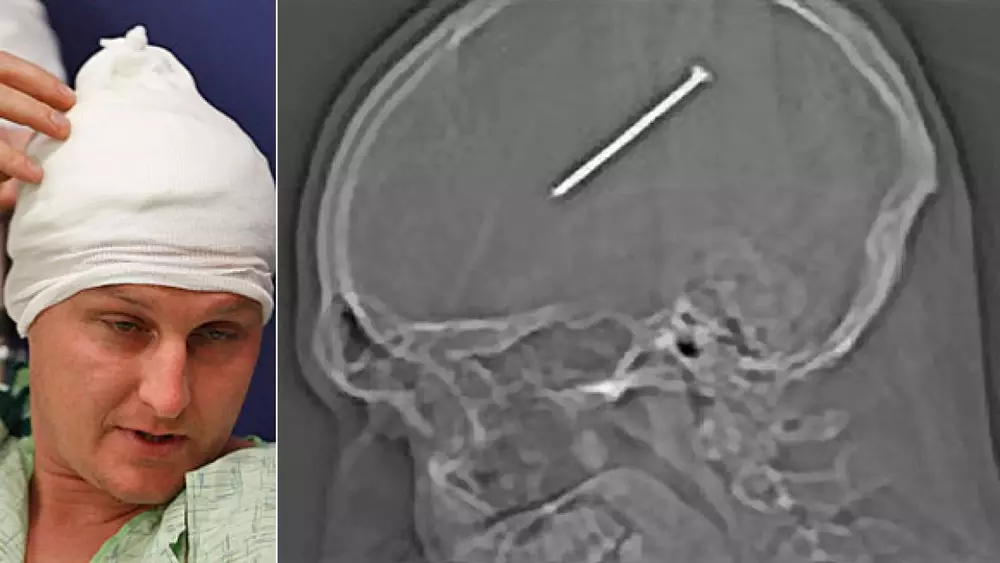 Житель Чикаго Данте Аутулло решил, что просто поцарапался и, закончив работу, отправился спать. К врачам мужчина обратился лишь на следующий день, когда почувствовал недомогание. Рентген показал, что в голове Аутулло находится гвоздь. "Когда они принесли снимок, я сказал: "Доктор, это шутка? Вы достали этот снимок чтобы разыграть меня", - вспоминает пострадавший.