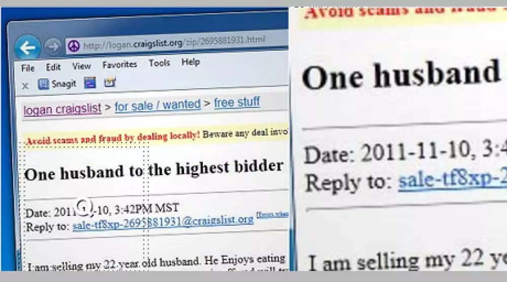 Элис Брэддли была недовольна тем, что ее возлюбленный сутками напролет играл в телевизионную приставку и совсем не обращал на нее внимания. Разозлившись, она разместила объявление на портале Craiglist, где предложила любому желающему купить ее супруга по договорной цене.