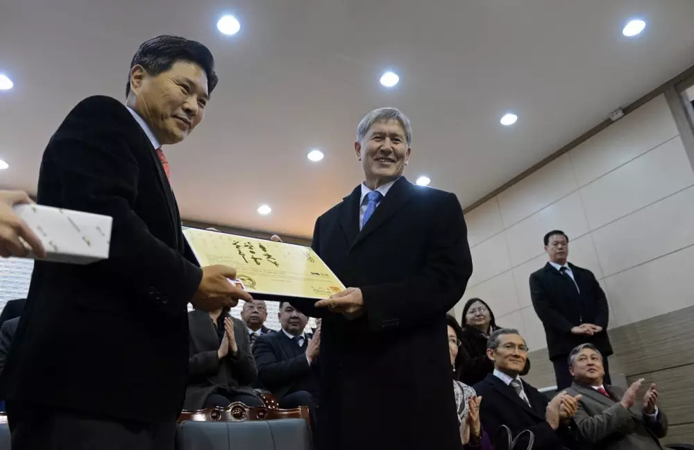 Атамбаеву присвоен почетный 9-й дан по таэквондо Ли Кю Хон вручает Алмазбеку Атамбаеву почетный 9-й дан по таэквондо. Фото: president.kg