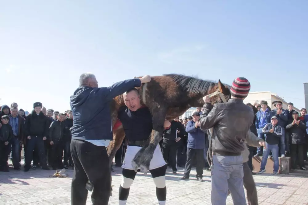 В первый праздничный день Наурыза жителей Кызылординской области удивляли своим мастерством настоящие батыры, передает корреспондент Tengrinews.kz cо ссылкой на отдел внутренней политики Жалагашского района области. В этот день на центральной площади поселка Жалагаш настоящие казахские батыры боролись за звание лучшего. Лучшим оказался участковый инспектор Жалагашского РОВД Нурлан Сенбеков, который смог с легкостью поднять и пробежать со 130-килограммовым камнем на спине 21 метр. На это же расстояние он пронес годовалого жеребенка весом 160 килограммов. Однако этого испытания жалагашским батырам показалось мало. И они устроили состязания по перетягиванию автомобиля "ГАЗель". Машина была припаркована на определенной точке, с которой его пытались сдвинуть. В данном соревновании победил батыр из аула Аксу Дархан Бакиров, который с легкостью протащил автомашину на 40 метров и остановился только потому, что судьи попросили его об этом.
