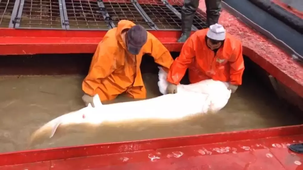 "Это первая белуга в этом году. Там наш ихтиолог, так он сказал, что белуга икряная. Взвешивать ее будем на заводе, чтобы не нанести рыбе лишние травмы, так как это очень тяжелый процесс. Я вообще удивляюсь, что попалась белуга, думал, ее в Урале уже нет совсем", - радостно рассказывает директор Курилкинского осетроводного завода Гильман Сарсемгалиев.
