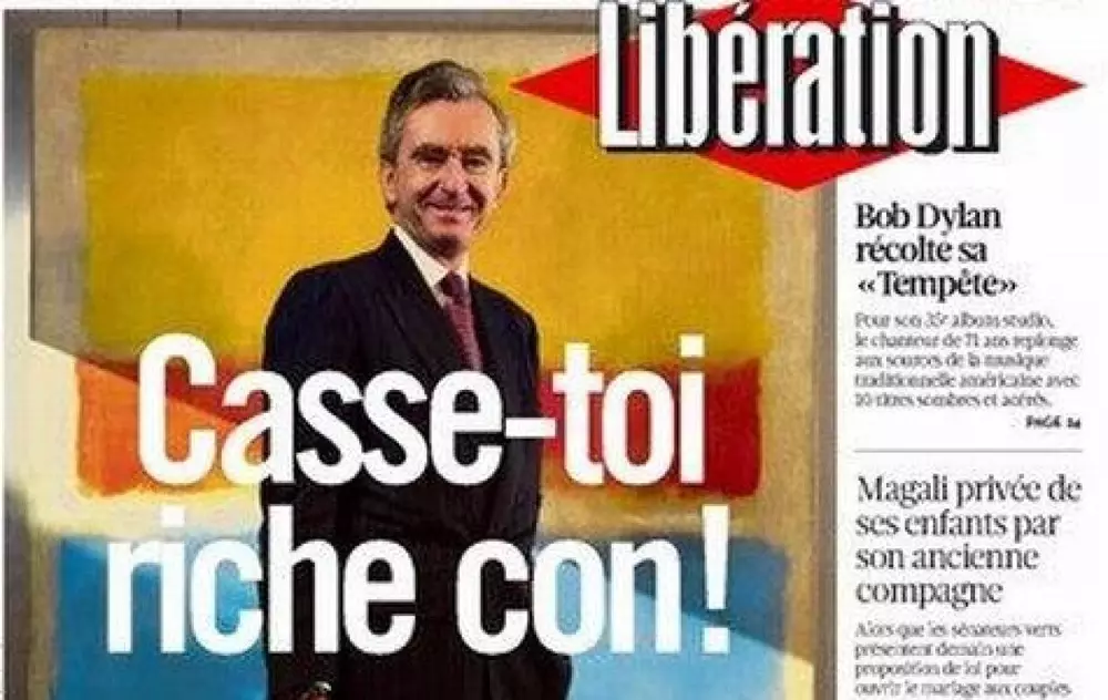 В понедельник газета напечатала "на морде" большую фотографию улыбающегося Арно с чемоданом в руке и крупной подписью: Casse-toi riche con! ("Вали, богатый придурок!"). Таким образом, журналисты обыграли известную фразу экс-президента Франции Николя Саркози, который будучи главой государства на одном мероприятии в Париже огрызнулся на человека, отказавшегося пожимать ему руку: Casse-toi pauvre con! ("Отвали, жалкий придурок!").