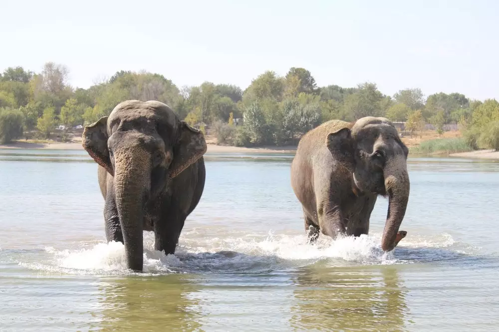 В Шымкенте для цирковых слонов устроили банный день, передает корреспондент Tengrinews.kz. На несколько часов двоих слонов - Магду и Дженни дрессировщики пустили купаться в озеро Тулпар, которое находится в черте города. Двоих 45-летних сестер Магду и Дженни привезли на специальном грузовике. Затем в сопровождении дрессировщика "дамы" проследовали на пляж. К слову, только вместе с дрессировщиком они отправились в воду и достаточно долго осматривались по сторонам, и не отходили ни на шаг от своего наставника. Спустя несколько минут слоны осмелели и принялись плескаться в воде. "Эти водные процедуры заняли несколько часов", - рассказали дрессировщики. Для перекуса артистам цирка принесли арбуз, а затем купание продолжилось. Чистыми и с хорошим настроением артисты выйдут на манеж 13 сентября на свое последнее выступление в Шымкенте. В городе слоны и другие артисты Варшавского цирка гастролируют уже полтора месяца. К слову, это единственное такое купание в озере за это время. До этого, в жаркие дни, животных купали из шланга.