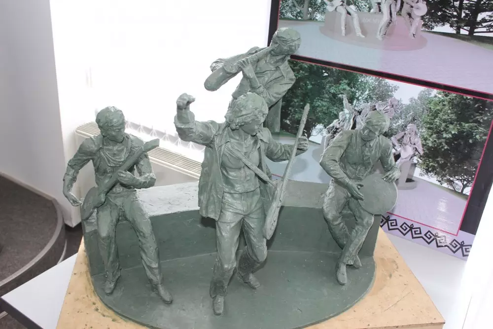 Эскизы памятной скамейки группы "Дос-Мукасан" на Коктобе показали в Алматы Макет будущего памятника легендарной группе "Дос Мукасан"