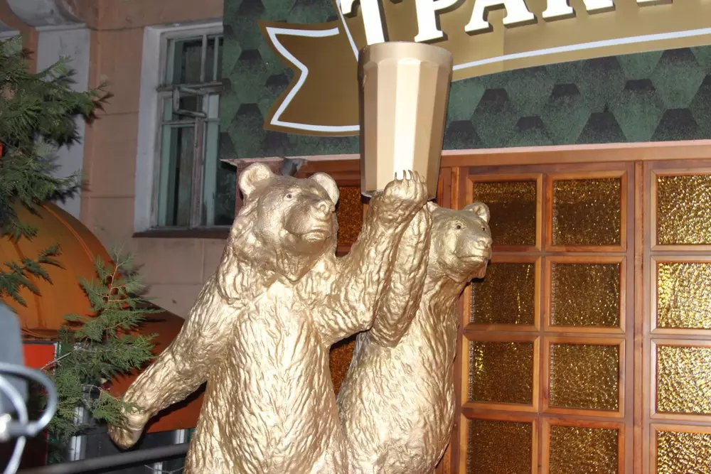 Скульптура высотой 2,60 метра представляет собой двух медведей, стоящих на камне и держащих большой граненый стакан. Над идей памятника работали пять человек, а его презентацию приурочили к открытию нового ресторана. По словам менеджеров ресторана, они надеются, что эта скульптура станет символом их заведения и привлечет посетителей.
