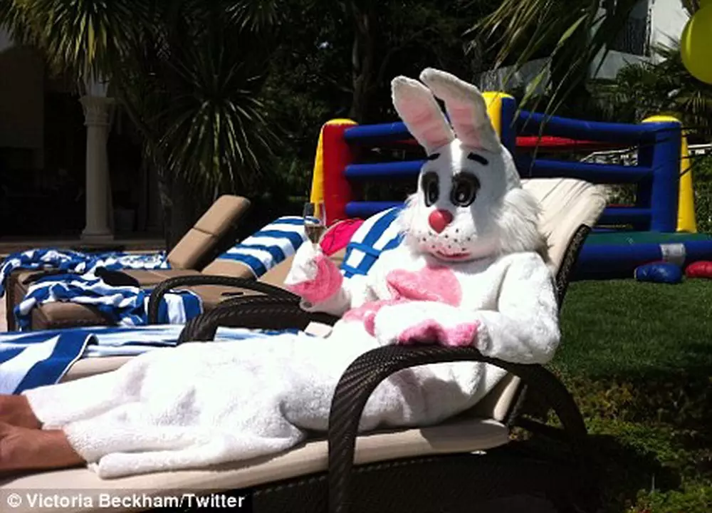 Дэвид Бекхэм в своем кроличьем одеянии спрятал от трех сыновей золотые яйца дома в саду в Лос-Анджелесе. Пока он развлекал детей, его супруга Виктория сделала пару фотографий и выложила их в Сети. Под снимками экс-"перчинка" оставила надпись "Угадай, кто?". На одном из фото глава семьи в своем пушистом костюме стоит на скейтборде в гараже с футбольным мячом в руках, на другом - лежит возле бассейна в шезлонге с бокалом шампанского.