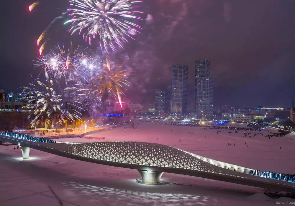 "Новогодний фейерверк разразился в полночь над Мостом Атырау, который охватывает замерзшую реку Есиль. Дизайн этого пешеходного моста вдохновлен местной (для Казахстана. - Прим.) разновидностью осетровых", - пояснил своим подписчикам Штейнмец.