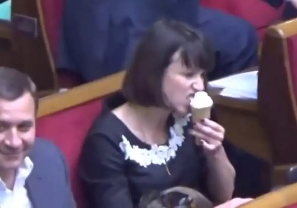 На Украине у пользователей соцсетей набирает популярность видео, как народный депутат Верховной Рады от партии "Народный фронт" Татьяна Черновол ест мороженое в сессионном зале прямо во время заседания парламента, передает корреспондент Tengrinews.kz.