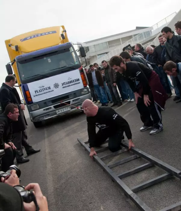 32-летний грузинский спортсмен Лаша Патарая установил мировой рекорд, сдвинув с места с помощью веревки, привязанной к его левому уху, грузовик весом 8,28 тонны и протащив его на расстояние в 21,5 метра, сообщает "Новости-Грузия". Рекорд был установлен на международном автодроме в Рустави в присутствии основной и альтернативной комиссии. В ближайшее время рекорд будет отражен в Книге рекордов Гиннесса. "Я готовился два месяца к этому рекорду. После стольких усилий и тренировок все прошло успешно. Я не ожидал такого достижения. Максимум я рассчитывал протащить грузовик на расстояние в десять метров, но результат превзошел ожидания в два раза. Это был самый сложный для меня рекорд, как весом, так и эмоциональной нагрузкой. Я посвящаю этот рекорд своему сыну Александру, которому исполнилось три месяца, а также моей стране", - заявил рекордсмен.. Лаша Патарая - спортсмен, обладатель звания чемпиона Грузии по греко-римской борьбе. Первый рекорд по перемещению тяжестей он установил в октябре 2003 года, когда ушами, к которым были прикреплены канаты, сдвинул с места микроавтобус весом 2,35 тонны и протащил его на расстояние 48,6 метра. В апреле 2006 года Патарая одним ухом сдвинул с места два микроавтобуса весом 4,5 тонны и протащил их 41,1 метра, а спустя полтора года передвинул на расстояние 26 метров вертолет весом 7,73 тонны. Также в октябре 2003 года Патарая побил мировой рекорд жителя Китая, подняв с места с помощью привязанных к его ушам груз весом 52,5 килограмма и удерживая его 19,9 секунды. В апреле 2010 года он поднял с места с помощью привязанных к его ушам веревкам груз весом 88 килограммов и удерживал его 12,3 секунды.